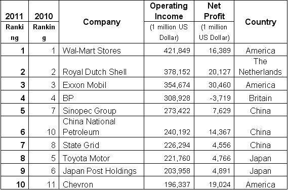 July7, 2011 at 9pm (Beijing Time), "Fortune" magazine just released the 2011 Global Top 500 list, based on operating income in 2010.